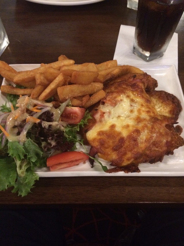 Hey mate im a brissy chef and ive been following posts. I just wanted to point out some missing bits in your review. Those chips have been cooked and refried. They form that white residule marks on them because they have been salted and then dipped again. They are obvious as hell you dont get chips like that crispy without refrying them at least twice. I dont know how u can say the presentation of this dish is good when it actually looks like sh*t. Refried chips, parmy way overcooked and a side salad with no topping garnish let alone the missing slaw.