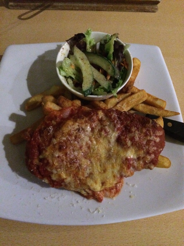 Side Dishes: This is where my main criticisms about the Aspley Hotel’s chicken parmigiana arise. I am always concerned when I see a salad come out in its own bowl: to me that connotes that the salad has been pre-prepared and refrigerated. My concern was well founded here. The chips were just a bit bland for my liking as well as being a bit over cooked.